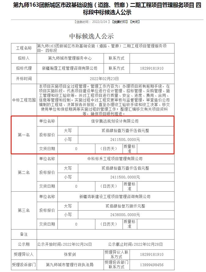 2022年02月,新疆第九师163团新城区市政基础设施(道路、管廊)二期工程项目进行公开招标,经评审专家综合评审,采购人确认,确定信宇腾远规划设计有限公司中标第九师163团新城区市政基础设施(道路、管廊)二期工程项目管理服务项目-四标段(全过程管理)。
