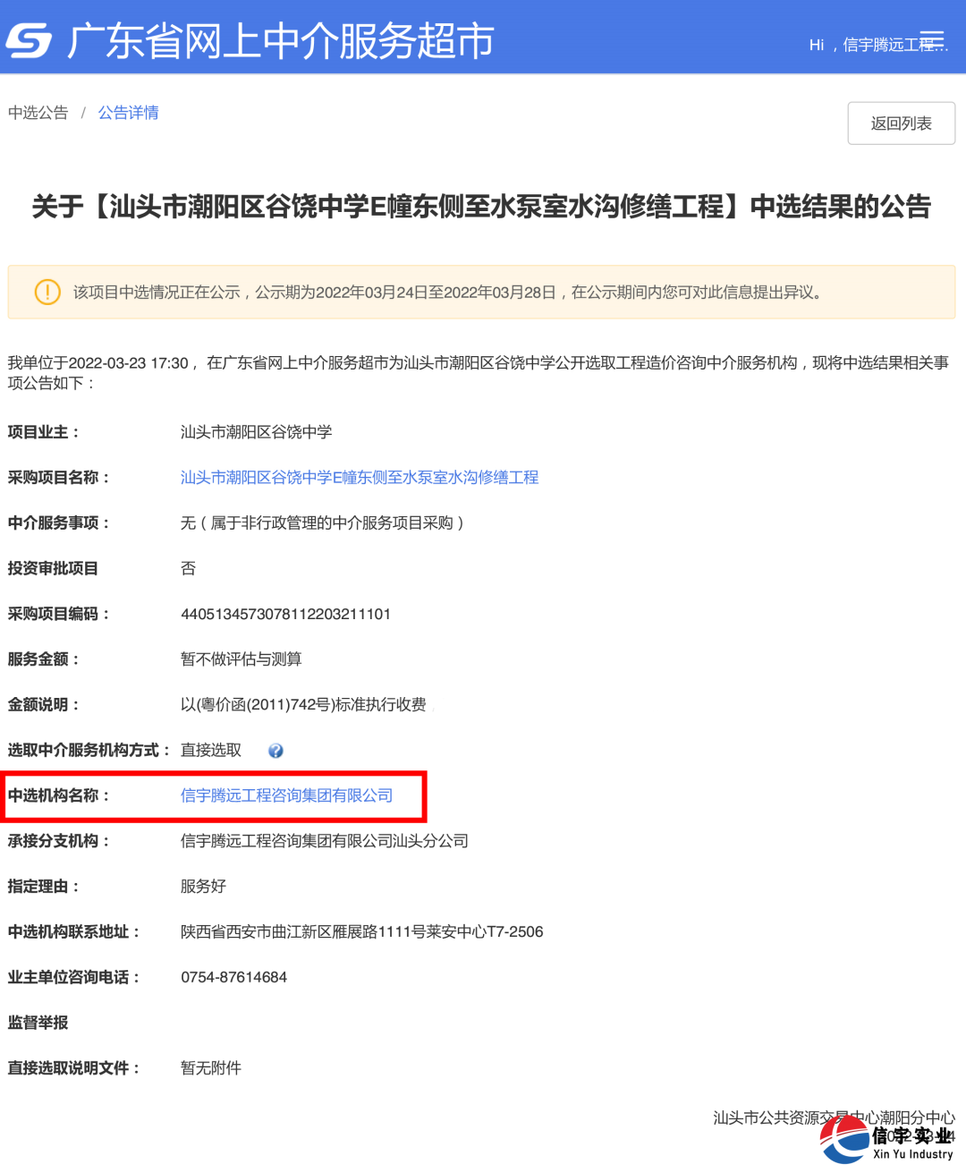 210cc大资本 2022年3月,信宇腾远工程咨询集团有限公司通过广东省网上中介服务超市直接选取,中选汕头市潮阳区谷饶中学E幢东侧至水泵室水沟修缮工程(工程造价咨询)。
