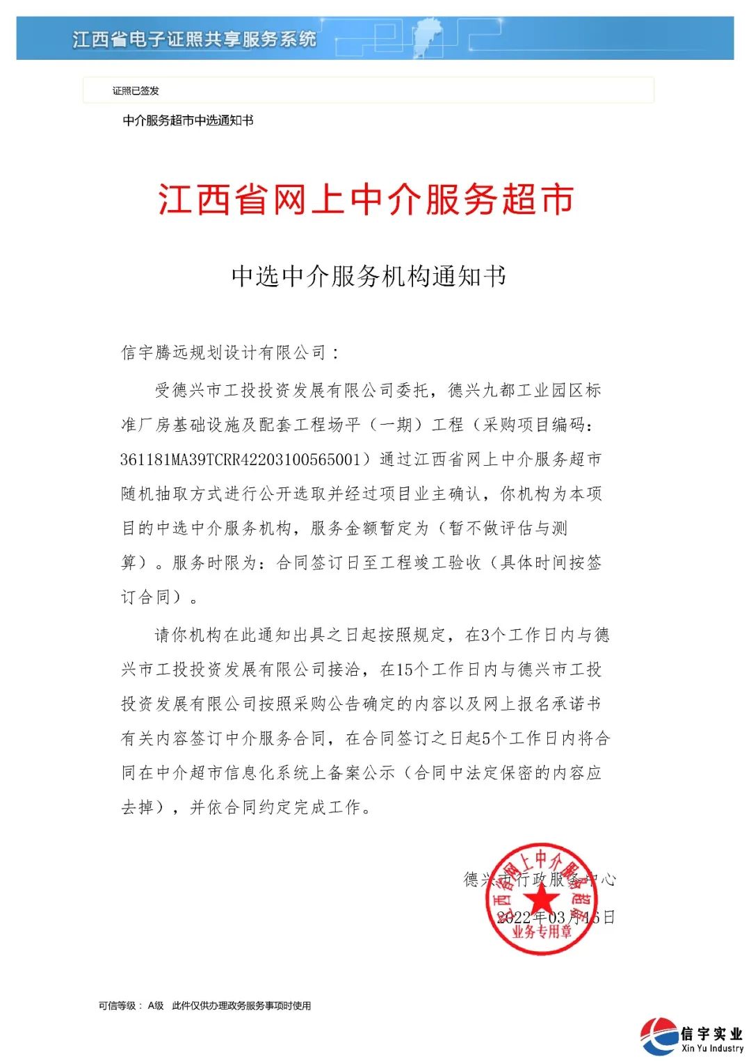 210cc大资本 2022年3月,受德兴市工投投资发展有限公司委托,通过江西省网上中介服务超市进行公开选取并经过项目业主确认,确定信宇腾远规划设计有限公司中选德兴九都工业园区标准厂房基础设施及配套工程场平(一期)工程(工程勘察)。