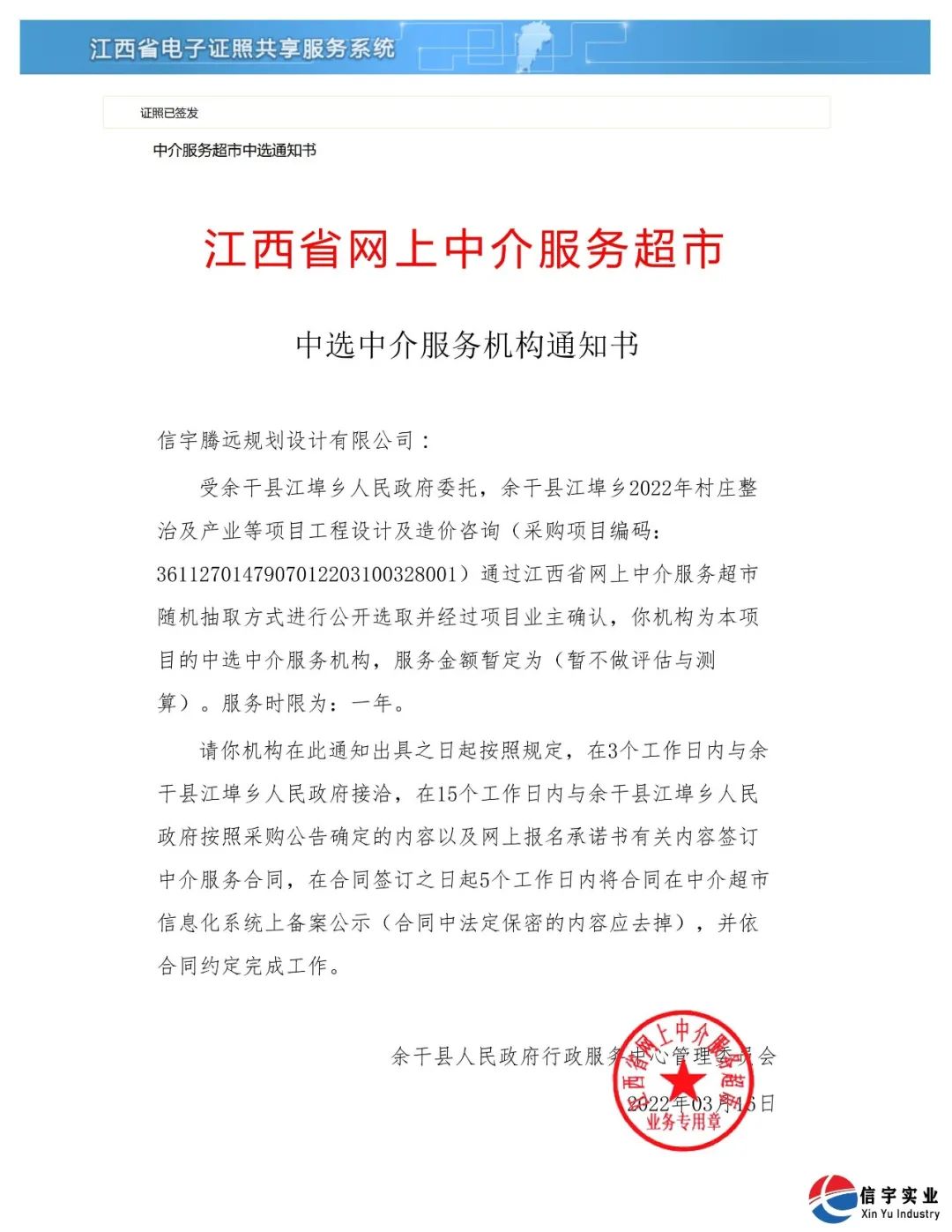 210cc大资本 2022年3月,信宇腾远规划设计有限公司通过江西省网上中介服务超市进行公开选取并经过项目业主确认,中选余干县江埠乡2022年村庄整治及产业等项目工程设计及造价咨询(工程设计,工程造价咨询)项目。