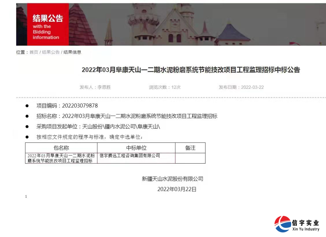 2022年3月,新疆天山水泥股份有限公司阜康天山一二期水泥粉磨系统节能技改项目工程监理招标进行公开招标,经评审专家综合评审,采购人确认,确定信宇腾远工程咨询集团有限公司中标2022年3月阜康天山一二期水泥粉磨系统节能技改项目工程监理招标。